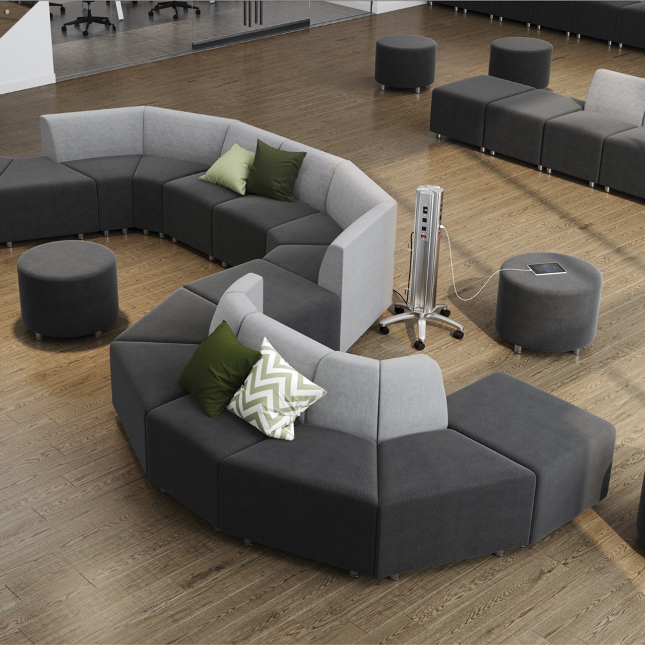 Have convenient access to power within any collaborative workspace, with this sleek and versatile four sided mobile power tower from OfficeSource. This power tower has two electrical outlets as well as 2 USB ports on each side, making it perfect for multiple users to be connected at the same time. This mobile power tower is ideal for laptops and tablets in your workspace, as it is easily mobile on its heavy duty casters. This power tower is available in a sleek silver color that will look great in any office setting. This power tower also comes with a 14′ power cord so you no longer have to worry about extension cords being a hazard.