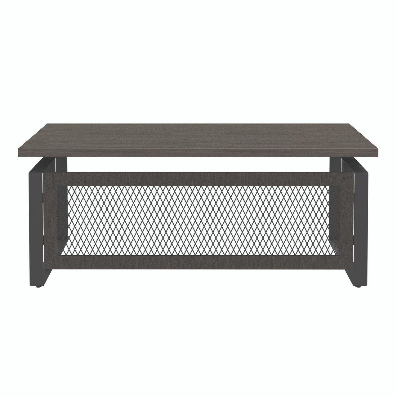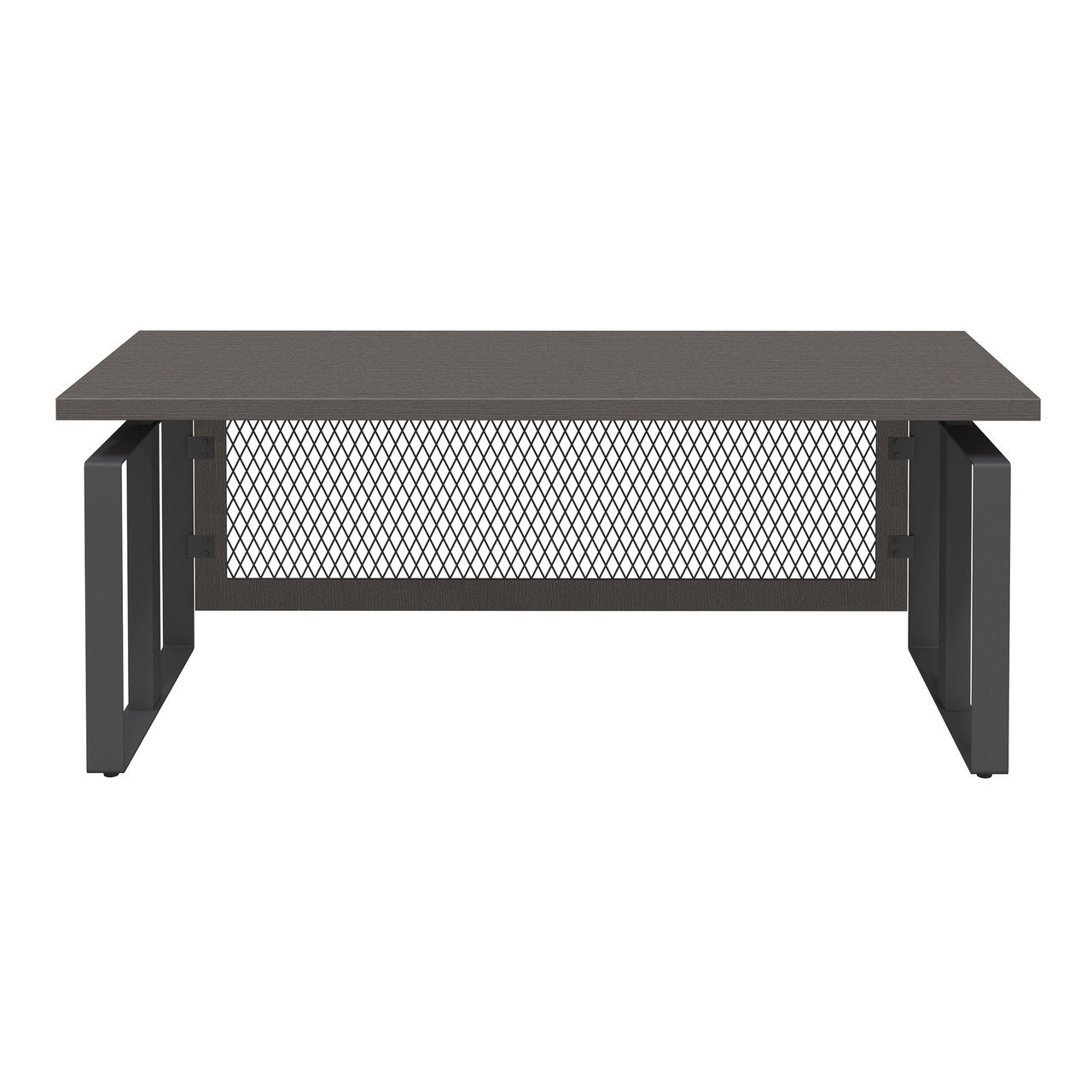 - A 1⅝” thick work surface floats effortlessly above sleek steel squares with three points of contact at each end of the desk