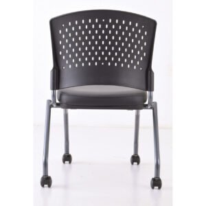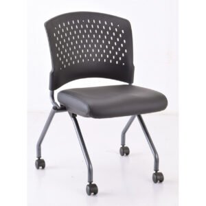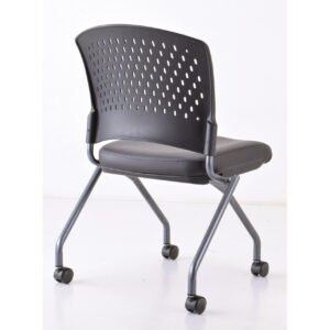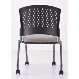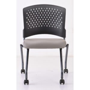 The Armless Nesting Chair with Casters features chairs with a titanium frame and fabric seats. It comes in a variety of upholstery colors.