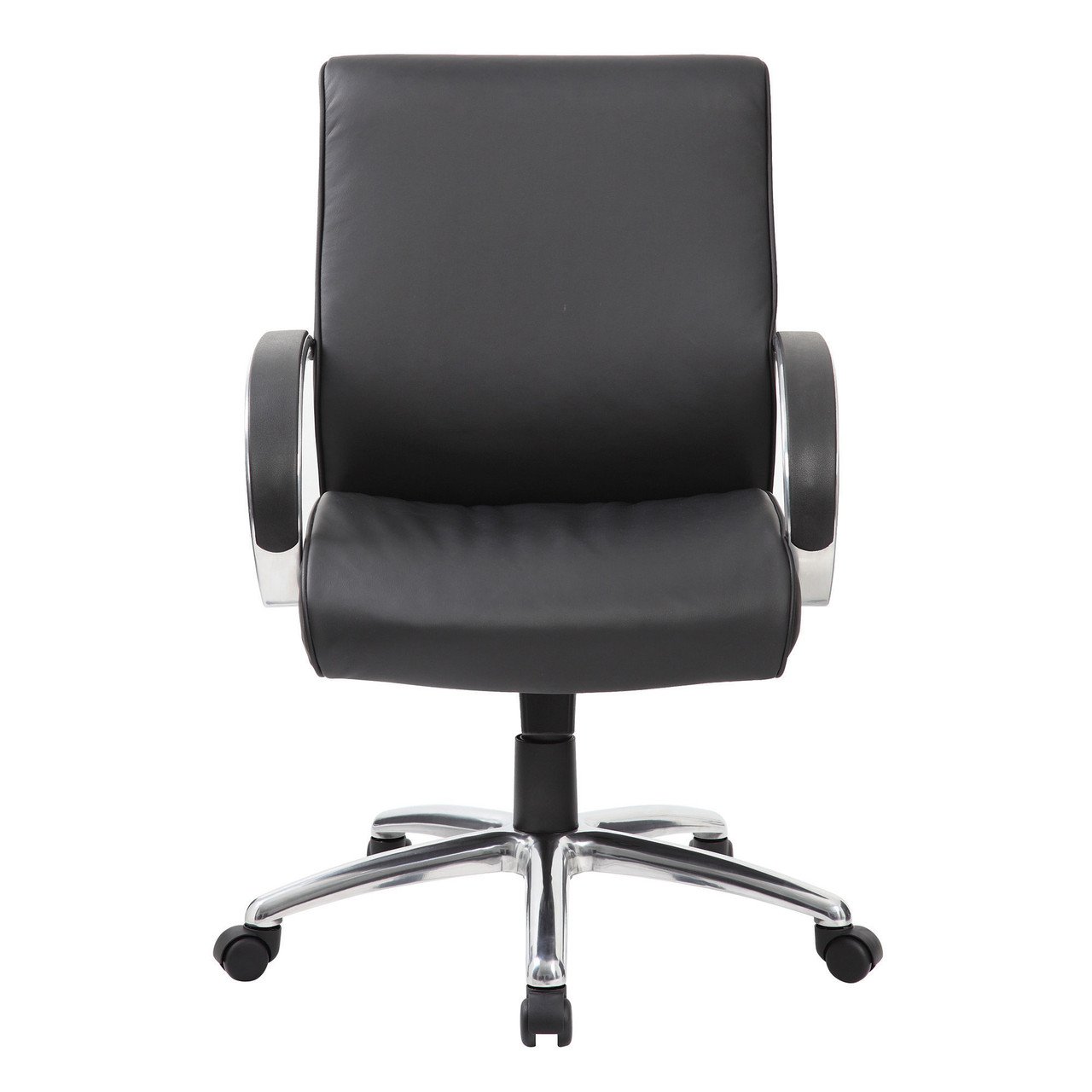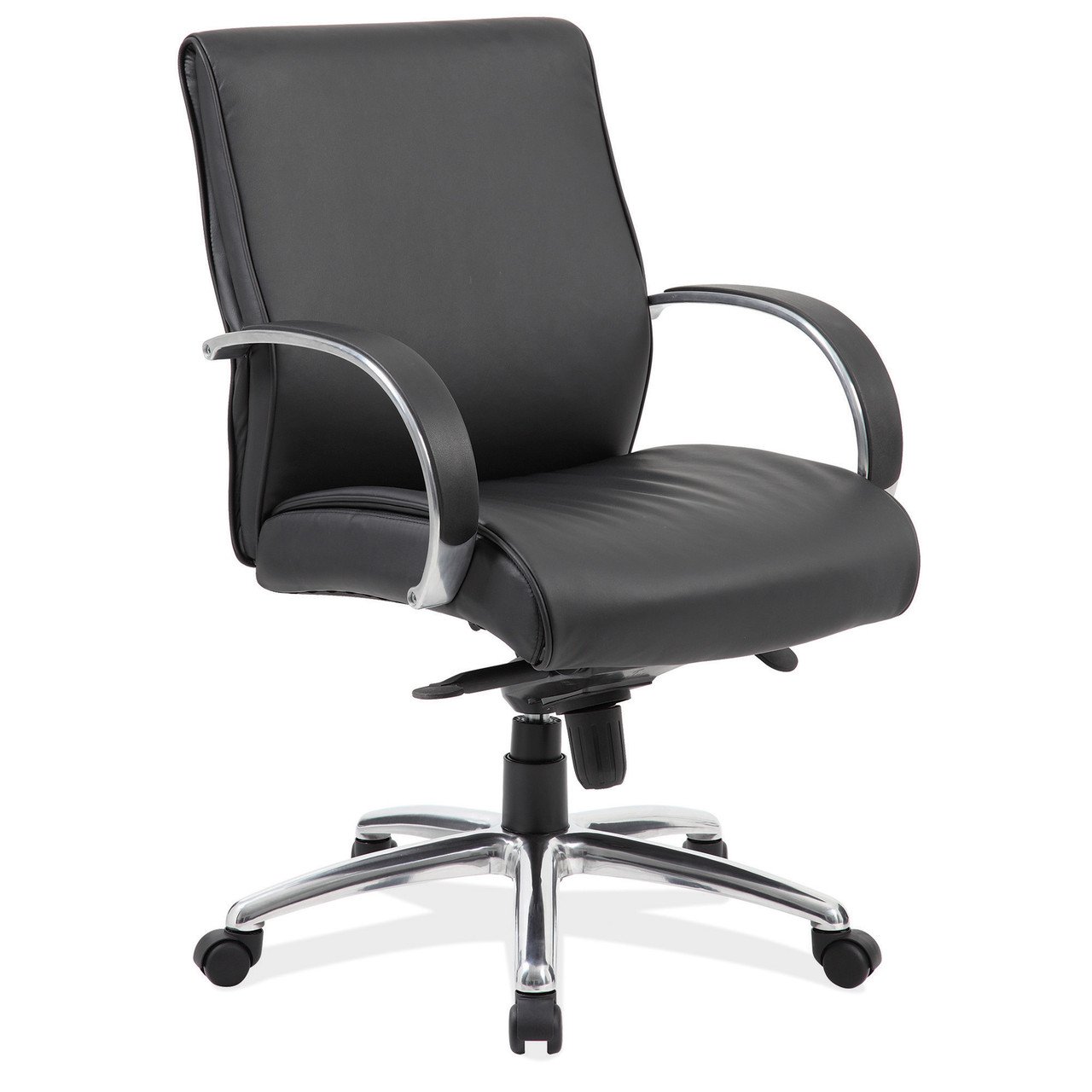 This mid back executive chair comes upholstered with a beautiful, ultra soft, and durable CaressoftPlus black soft vinyl. This mid back chair features polished aluminum arms topped with soft arm pads, a knee tilt mechanism, pneumatic gas lift seat height adjustment and adjustable tilt tension control. This chair comes with a large 27” base for greater stability and hooded double wheel casters for increased mobility.
