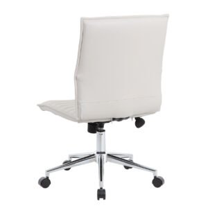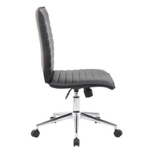 This armless task chair is designed with a look that brings any room or office to the next level. The chair features a gorgeous and strong chrome 25 inch base with 2 inch nylon dual wheel castors that adds that perfect pop of metallic color to any room. In addition to looking fantastic, the chair also features a spring tilt mechanism, a pneumatic gas lift for easy height adjustability, tilt tension and an upright lock, while also boasting a weight capacity of 275 lbs.