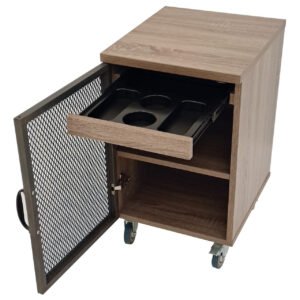 The distressed wood laminate top creates a reclaimed aesthetic. Two shelves with a pencil drawer giving one added space and organzation. Heavy Duty locking casters on wheels for extra security. Black metal mesh doors create partial privacy.