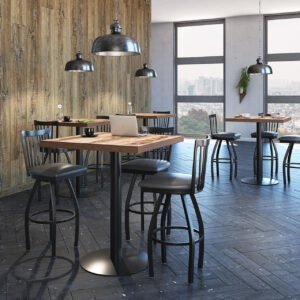 This cafe height, high back wood chair is great for any breakroom, cafe, or restaurant. Coming in all black, this chair is sure to fit well into any space. The chair features a bowed leg design, offering both design and durability. The footring provides that extra bit of comfort. With 360 degree swivel capabilities and clear commercial grade glides, this chair comes equipped with all necessary functions and accessories needed for the perfect chair.
