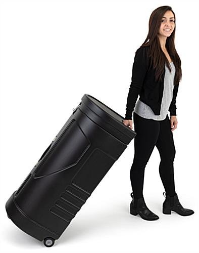 Our travel case podium stand features smooth-gliding casters for increased mobility between trade shows and a 16″w x 15″d countertop table for impromptu presentations on the go. This portable counter is constructed from heavy-duty polyethylene (HDPE) capable of taking hard hits while on the move. Inside the black travel case podium stand, 0.25″ of EPA foam offers added protection to safeguard trade show products and prevent damage during transport. Each unit features 2 edge wheels with 1″ of ground clearance for uninhibited movement over uneven terrain as well as a solid molded handle to help you maintain a secure grip. The interior of our portable table is perfect for carrying tripods, multiple banner stands, 6′ & 8′ tabletop pop-ups and other trade show essentials. This travel case podium stand is reinforced with a locking butterfly latch which keeps valuables secure