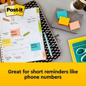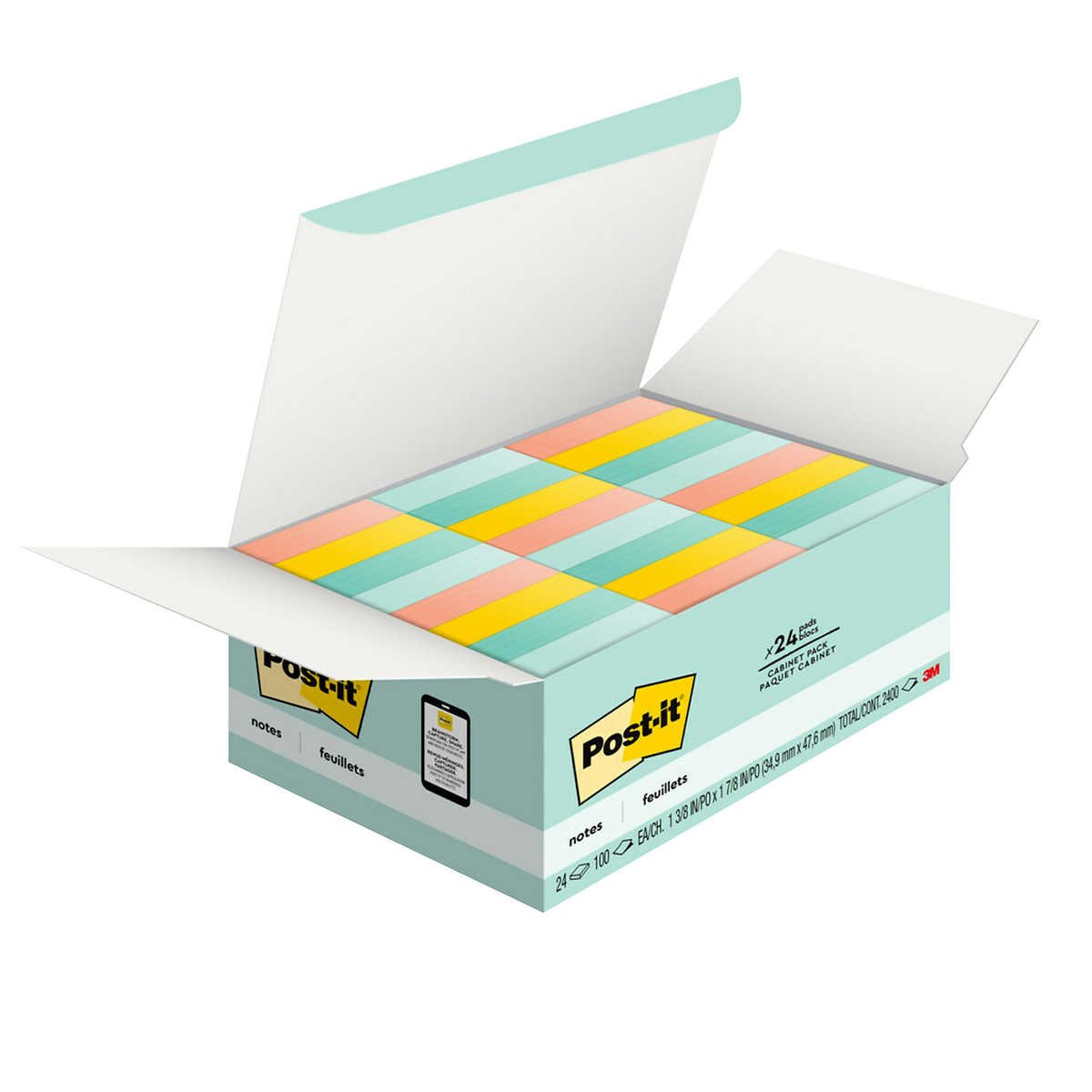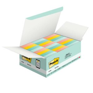 Post-it Notes in 1 3/8 in x 1 7/8 in stick securely and remove cleanly, featuring a unique adhesive designed for use on paper. They are great to call out important information or leave notes in calendars or planners. Value pack is great for home or office. Imagine yourself at the shore with the coastal tones of the Beachside Café collection. Post-it Notes are recyclable, and the paper in Post-it Notes is sourced from certified, renewable and responsibly managed forests.