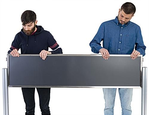 This post and panel advertising barrier system creates a structurally rigid queue line with plenty of branding potential. Designed to be fully modular and expandable, each square stanchion has four available slots to link partitions together, allowing for incredibly varied arrangements. Easily incorporate custom signage into this structurally rigid post and panel advertising barrier system by inserting your own marketing materials or branding pieces to the partition frames. Two non-glare PET lenses and a sturdy foam backer ensure that printed signage are kept secure and protected. This basic configuration contains one 15” tall partition and two stanchions, making it the perfect choice when creating your own purpose-built queue line. Show off your branding or promote a new product while managing customer traffic with this post and panel barrier system.