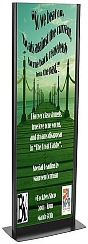 This adjustable poster stand is a great way to frame your graphics, even in the busiest of stores and venues. Double sided with PVC lenses and a center panel, this floor standing sign holder protects your graphics from light damage and maintains a crisp display. No matter how tall or short your graphics are, this height modifiable poster stand can accommodate any print with a width of 19″ and a height of your choosing. With a box cutter, you can easily cut the included PVC lenses to the ideal size for your needs. The aluminum frame and steel base of this sign holder are sturdy enough for multiple uses and years to come, from a crowded trade show floor to a fast paced retail store.This poster stand is an ideal display method if you desire size customization for your signage frames.