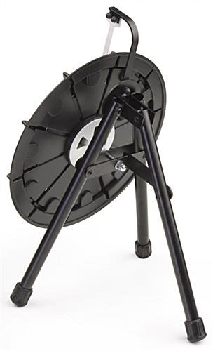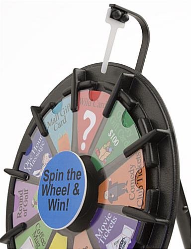 This mini prize wheel entertains guests during office meetings, trade shows, retail promotions and fundraisers. The tabletop gaming display has a 10-slot design, allowing users to customize each section with their own awards. The micro prize wheel measures only 14″ in diameter. The unit requires only a small area when positioned on a counter, yet has the same effect as larger, floor-standing models. Durable ABS and PETG plastic construction generates the clicking noise, while remaining strong and long-lasting. This mini prize wheel that spins with ease is so small, a user can easily travel to events and trade shows without needing large cases or containers. No additional hardware is required to assemble the game!