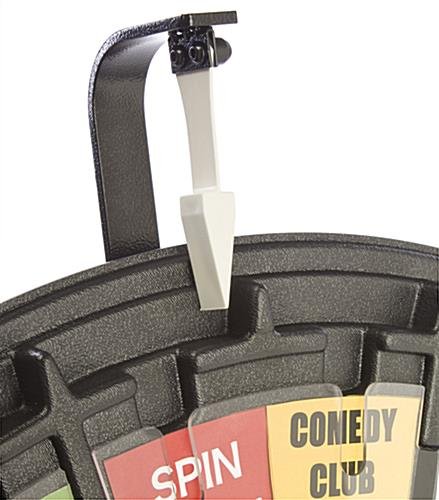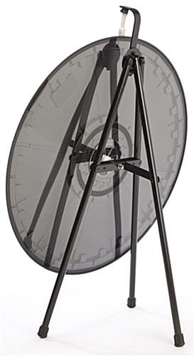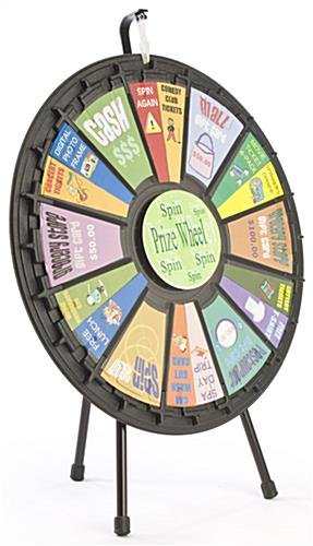 The game wheel has a tripod stand, with rubber feet, to keep a display in place even when the most excited participants play. Simply position a spinning display on a table or counter to have your activity at eye-level. This game wheel, or wheel of fortune, is constructed from ABS and PETG plastic, making the fixture light enough to carry yet strong to withstand frequent usage. Additionally, the tabletop gaming fixture weighs only 11 pounds, making trips to and from events incredibly easy. This prize wheel will add an element of entertainment to any presentation or gathering, ultimately helping to improve sales and success.