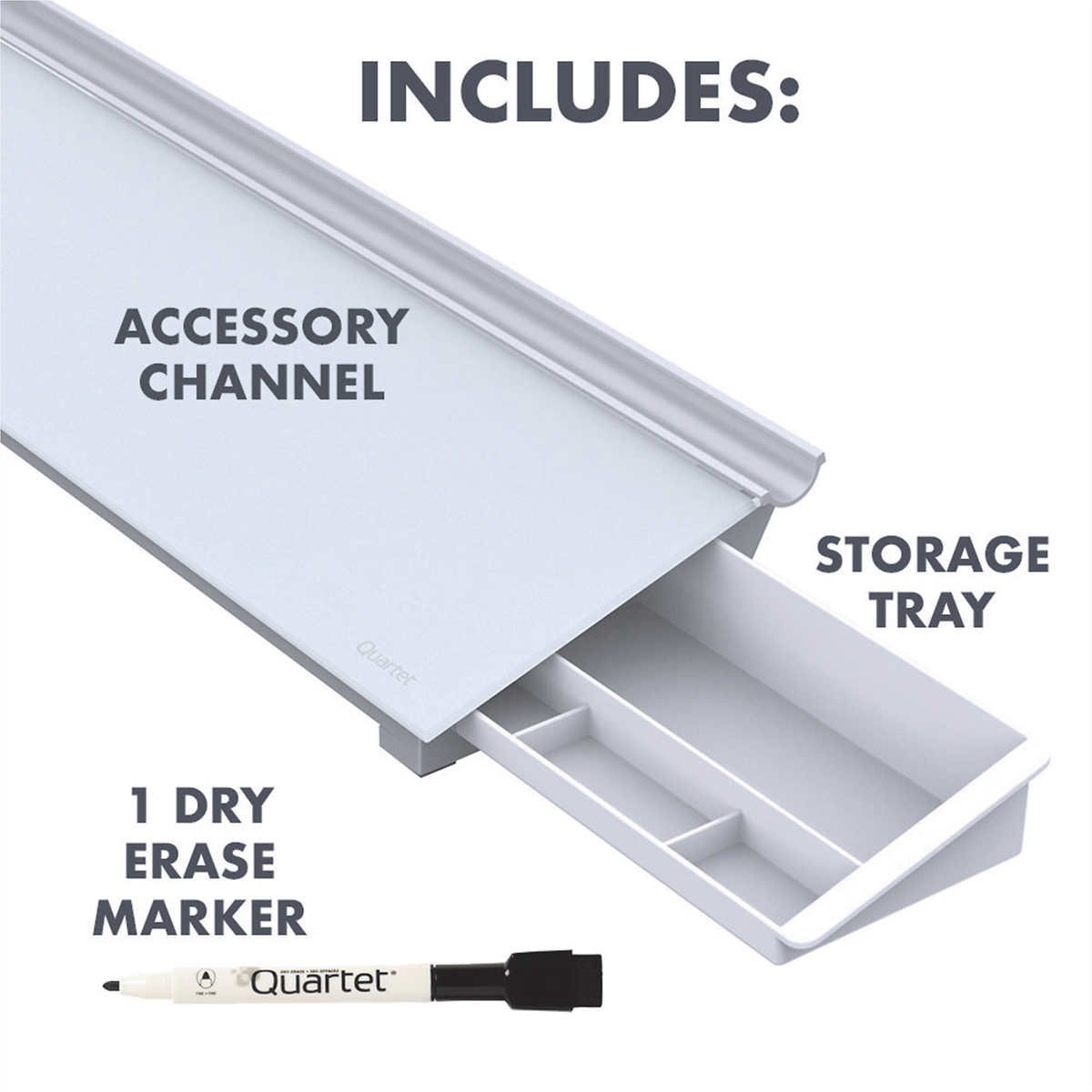 - Rail across the top holds dry-erase markers, and one Quartet dry-ease marker with a cap-mounted eraser is included