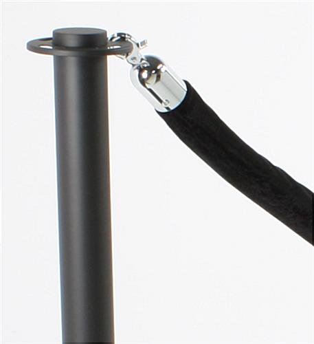 - Modern flat-top stanchion design features black powder-coated steel posts and black velvet hanging rope to provide an upscale means of crowd control, line queuing or display protection
