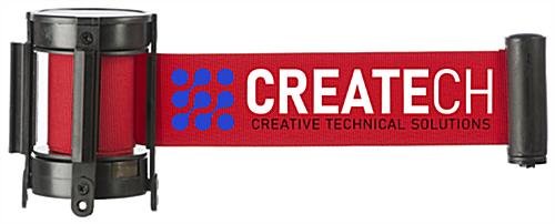 This is a red custom stanchion belt with 3 color printing for promoting company branding while maintaining crowd control. Utilize these 6.5′ long retactable barriers with 4 way belt receiver to configure organizational guides. Available with single or double sided silkscreen graphics, these customizable nylon bands provide ample space to showcase logos and business emblems. Compatible with the QueuePole.Economy Series assembly is easy by simply attaching the cartridge to the post top and securing with screws.