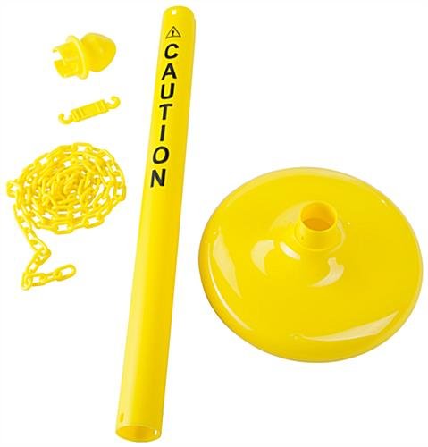 Use these plastic caution posts as portable safety signs for indoor or outdoor use as a warning to the public to avoid dangerous areas. Complete with a 6.5’ long chain and pre-printed message, this QueuePole.Outdoor stanchion arrives as an easy-to-assemble kit for immediate use. Set these yellow caution posts in an outdoor or indoor location to guide the public, such as at construction sites or restricted access areas. While traditional safety signs are either cumbersome or designed for permanent placement, this stanchion is lightweight for easy mobility and ideal for temporary situations. If needed, fill the hollow base with sand for up to 15.5 lbs of stability to help prevent tipping on windy days or in crowded spaces. As well, the chain is made of a series of links that connect to each of the caution posts via C-hooks to create barriers and help enforce your warning message.