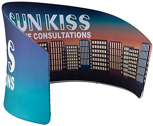 offers double-sided printing to attract visitors from all angles! Set-in with a full color dye-sublimation process, the custom artwork is guaranteed to keep its color and luster through use after use, even if machine washed. However, a drawstring bag is provided with the fabric graphic to help keep it from getting dirty and having to be washed! Once ready, have a partner help you pull the graphic over the curved frame and zip tight at the bottom for an easy yet impressive display of your branding, products, and overall business!