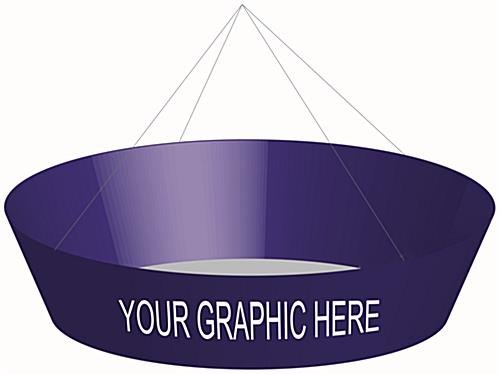 This is a replacement graphic for TRNDHB104, our asymmetrical round hanging ceiling banner. The ceiling banner graphic is 115.2”w x 22.6”h to fit the 10’ frame of the listed pop up fixture. Custom artwork can be designed using the templates. This graphic is dye-sublimated using CMYK full color on a single side. The ceiling banner frame and hardware are sold separately.