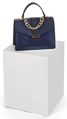 Utilize this square pedestal stand and make a floor standing piece or on a countertop for an eye level unit. The display cube touts a white laminated melamine finish for added appeal. The particle board construction of the white pedestal stand is collapsible and can be assembled with the included hardware. The white display cube can be utilized in a retail store, book store or even museum. The stand is lightweight with a hollow center, but can hold up to 130 pounds! If you’re looking for a full retail showcase, be sure to make this unit the centerpiece for a modern look!