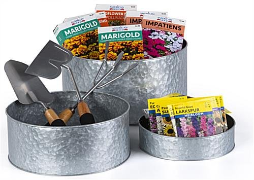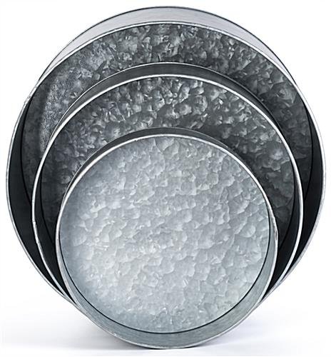 These round galvanized risers come in a set of small, medium, and large sizes to provide you with a unique rustic-looking retail display in your boutique, garden center, jewelry store, or home décor shop. Use these pieces either as pedestals or flip them and use them as a dump bin to showcase smaller items like accessories, knick-knacks, or gift cards! These round galvanized risers have a vintage-looking finish from using a hand-applied distressing technique to create a naturally-aged and worn appearance. Each rustic tabletop pedestal has a 15-pound weight capacity making it great for smaller-scale retail displays. The set comes with three different sizes, 8″, 10″, and 12″ in diameter, to help you create a unique exhibit. Our vintage dump bins can nest within each other for easy transport or storage, making them great for farmer’s markets, art festivals, and craft fairs. These rustic round galvanized risers will make it easy to enhance your retail displays and make your products stand out in any space!