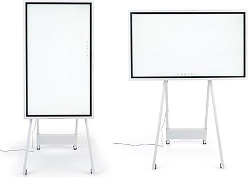 This interactive digital flipchart display elevates productivity and collaboration in your classroom, office, or design studio. This Samsung unit has an adjustable 4K UHD 55″ touch screen that can rotate between portrait or landscape orientation with ease. This sleek modern signage solution has a mobile design, making it easy to move around from one conference room or classroom to the next. If you prefer a stationary device, the screen can be removed from the stand and mounted to the wall. The Samsung interactive digital flipchart will make meetings and brainstorming sessions more productive with a smooth pen-to-paper-like writing experience and touch-out functionality that allows users to sync their personal devices for real-time content sharing and control, so you no longer have to jump through hoops to distribute documents, graphs or notes to your staff or students. This mobile signage also has built-in speakers allowing you to play videos and music when connected to WiFi or Bluetooth, creating a more engaging and immersive lecture experience for all involved! The touch screen unit includes a passive pen that attaches to the frame with a magnet and has both pen and marker-like stroke options and a wide range of color selections. This Samsung digital flipchart signage makes for engaging and collaborative presentations, replacing cumbersome paper charts, messy whiteboards, and dried-out markers!