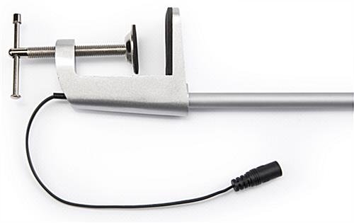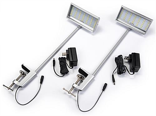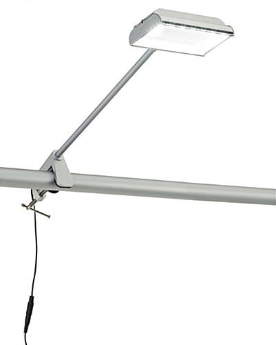 These LED display arm lights are a modern and energy efficient way to illuminate graphics on your exhibition backwall. The sleek, low profile design features a thin but sturdy stem with brushed silver finish. Each set of padded clamp LED display arm lights includes a convenient, extra-long 2-part power cord. Use this long-lasting bright white fixed stem flood lighting to draw visitors to your booth with neutral color 12-Watt illumination. Point the swivel and tilt head toward your message to highlight logos or product imagery. These LED display arm lights with adjustable clamps accommodate poles up to 2″ in diameter.