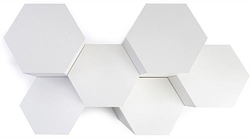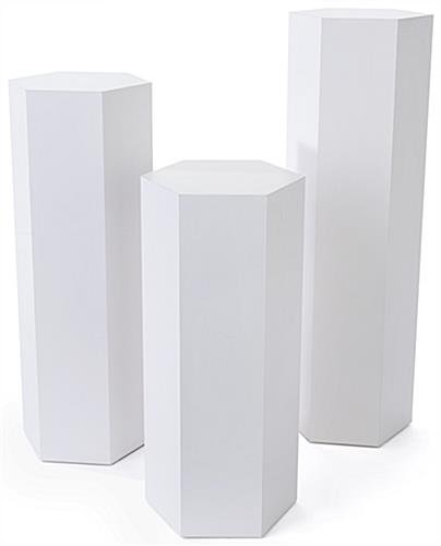 This set of 3 hexagonal gallery pedestals is made of laminated white particle board for a sleek and cost-effective design. These modern retail fixtures are perfect for store and boutique product displays, museum or art gallery showcase, or wedding/event décor. These hexagonal gallery pedestals are sold together to conveniently provide you with a 30″, 36″ and 42″ stands that can be used individually or together to create one impactful exhibit. These hexagon retail fixtures are reinforced with rubber feet on the bottom to help them stay in place and prevent them from scratching the floors in your museum or boutique. With an overall width of 13.7″, there is plenty of space for you to showcase beauty items, designer bags, jewelry, sculptures, framed artwork or photography, and so much more. This set of 3 hexagonal gallery pedestals will help you create modern displays that leave a lasting impression on your guests and customers long after they leave your store or gallery!