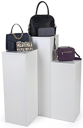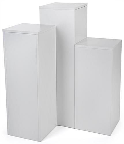 Arrange this square display pedestal set in a grouping or as individual pieces for a customizable product showcase. Perfect for stores or museums, each wooden stand is constructed with particle board and finish with a white laminate. The three piece display pedestal set has a 12.5” top surface to accommodate merchandise or specialty items. Each riser comes included with hardware and can be assembled or taken down in a matter of minutes. These white stands offer a complement to your existing décor while adding a functional yet modern touch. Tier the display pedestal set in a group to act as risers for showcases in museums or retail stores.