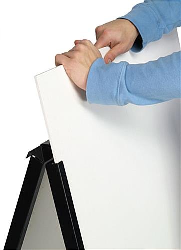 These yard sign holders are for showcasing (2) 30″ x 40″ advertisements. Each double-sided a-frame is ideal for attracting customers from any direction. These yard sign holders fold for easy storage. Each real estate lawn display is only 2-3/4″ thick when closed. These a-frames are yard sign holders that are easy to use. Open the display and lock into place by pushing down the (2) latches, lift them to close. Signage easily slides in and out of the unit by lifting the hinges on the top and sliding the boards into the channels for a secure fit. Yard sign holders, called a-frames, are made for thick poster board material such as Coroplast™ and Sintra®. Each advertisement can be up to 3/8″ thick. These yard sign holders are durably made, but they do not include any type of lens for protecting the messages. Since this a-frame is typically used outdoors, the advertisements should be UV printed with silkscreen, laminated, or vinyl graphics. These real estate signage frames are yard sign holders that are for two signs and can advertise for open houses or grand openings. Each black metal a-frame is often used by retail stores, real estate offices, travel agencies, and more.