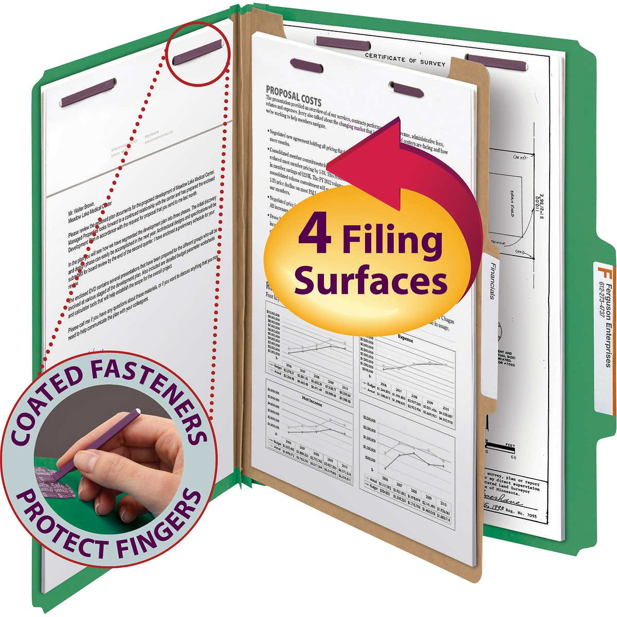 Protect your documents and fingers with Smead’s patented SafeSHIELD Coated Fastener Technology–the ultimate solution to fastener issues, including paper tears, finger cuts and excessive fastener crinkling. Fasteners on front and back panels and dividers create up to eight separate filing surfaces within one folder.