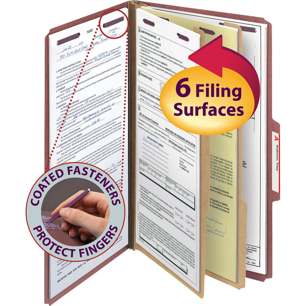 Protect your documents and fingers with Smead’s patented SafeSHIELD Coated Fastener Technology–the ultimate solution to fastener issues, including paper tears, finger cuts and excessive fastener crinkling. Fasteners on front and back panels and dividers create six separate filing surfaces within one folder.
