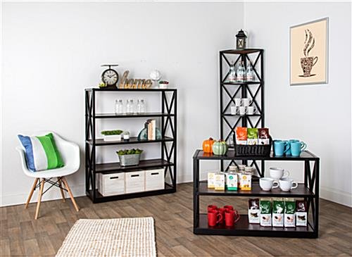 Use this rustic X frame metal corner unit to bring vintage industrial style into your home or retail store. Paulownia wood with a dark stain blends well with the durable steel frame to create a modern and welcoming design. The X frame metal corner unit has 5-tiers that provide ample space for retail store merchandising items, apparel or decoration. Included floor levelers ensure that the vintage industrial display remains sturdy. A dark wood stain complements a variety of decors and adds a welcome feel to any modern retail space or residence. This X frame corner unit is a trendy must-have for your home or boutique!