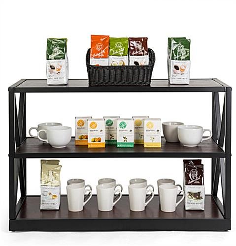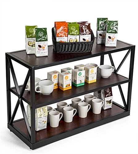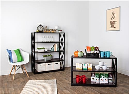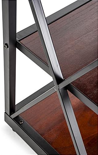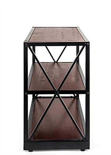 This x-frame media bookshelf is a modern take on a vintage fixture with three tiers for showcasing products or storing your home decorations. Use this etagere to create an industrial-chic retail display, a rustic-inspired TV stand, and more. This plank style media bookshelf is constructed from sturdy materials; each of the tiers is made from dark-stained solid paulownia surrounded by a steel support structure. Modern touches like floor levelers bring some quality of life improvements to this vintage-styled etagere. A generous width of 40” allows plenty of space for a variety of items and uses. Let the clean lines and open design of this bookshelf enhance the visual styling of your home or business.
