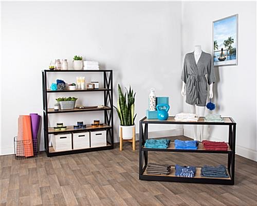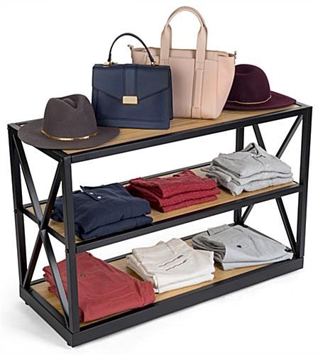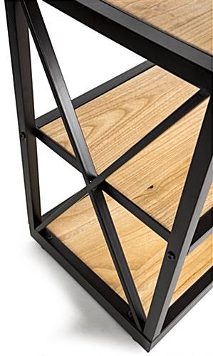 This French industrial console shelf has a steel frame and solid Paulownia wood boards that exude rustic charm and sophistication. A farmhouse-inspired look built from modern materials gives this bookcase a vintage aesthetic, without you having to worry about fragile, aging pieces and parts. This industrial console shelf with open storage makes for an inviting product fixture in retail settings or eye-catching décor display in cafés and restaurants. The three natural-finish tiers are equally suited for use as a bookcase in your home or creating just the right rustic aesthetic in your business. At just over two feet high, this console shelf also makes a great accent piece or entertainment center. Bring a modern farmhouse look to your space with this wood and metal fixture.