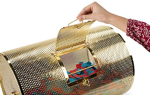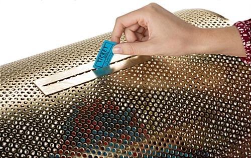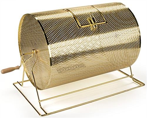 This large raffle drum is constructed from high quality wear-resistant brass plated steel, for thousands of spins. The brass raffle drum, including its sturdy base is 25″w x 16″d, and stands 18″ high. Each drawing box features a 5-3/4″ wide drop slot and an easy-grip polished wooden turning handle. The 6″w x 6″d trap door is centered on the raffle ticket drum and is reliably secured with a durable latch for easily drawing a winner or loading a large volume of tickets.