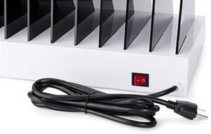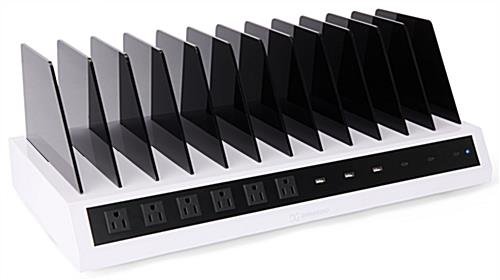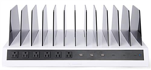 This tabletop charging station is perfect for any conference room, medical practice, or classroom with multiple devices to power. The counter unit has an open design conducive to servicing devices of various sizes, such as laptops, mobile phones, and tablets, perfect for guests and staff. It features 6 -AC, 3 -USB-A, and 3 USB-C outlets with USB fast charging protocols. This charging station also has removable acrylic dividers that allow more oversized items to fit vertically or horizontally. With overall dimensions of 24″L x 12″W x 8.77″H and dividers that help to keep the devices neat and organized, this unit is the perfect way to power electronics while eliminating countertop clutter. The sturdy unit weighs 18 pounds and requires minimal assembly. This stable tabletop charging station is perfect for any medical practice, office, or classroom looking for an organized solution to restore power to multiple devices.