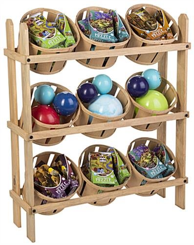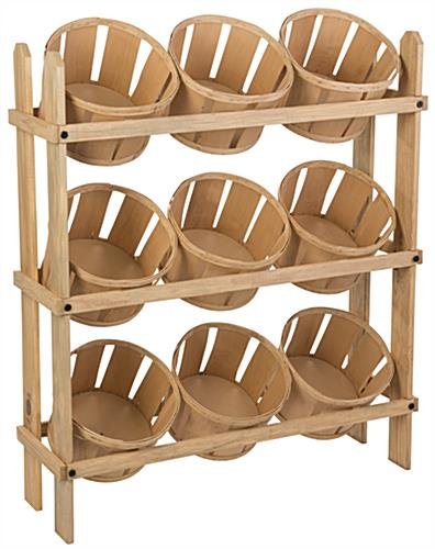 This bushel basket stand is the perfect rustic display for any store looking to add some country charm to its décor. Each unit comes with a set of 9 open bulk bins which gives customers easy means of viewing your products due to the angled positioning. Featuring a rich oak stain, pine frame and wooden baskets with MDF bases of this basket stand are designed for durability and make for long-lasting fixtures. With 3 tiers, this unit gives you plenty of space to customize how to exhibit your products at trade shows or point of sale. At 44” tall, this set of rustic display bins are guaranteed to garner attention and entice shoppers to explore your great items for sale. Make a beautiful showcase of your products with this 9-bushel basket stand!