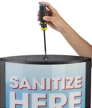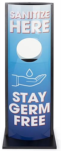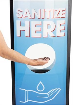 Our “Sanitize Here” touchless dispenser kiosk with double-sided pre-printed graphics is an innovative way to communicate public health messages. Our unique free-standing automatic station releases 1 mL of cleansing gel when the palm is placed in the center hole and can conveniently be accessed from both sides of the unit. This 49” tall “Sanitize Here” touchless dispenser has generic and vibrant pre-printed graphics that will help guide customers, guests, and employees to this essential hand hygiene service. Our automatic kiosk features two colorful acrylic lenses, motion sensors, and a built-in drip well, making it great for placement in banks, medical office waiting rooms and restaurant common areas. No expensive or exclusive replacement cartridges are needed for this station, as the refillable 1000 mL container uses your favorite free-pour gel cleanser. Place this battery-operated “Sanitize Here” touchless dispenser with clear and concise public health messaging on your retail establishment or office environment as a way to eliminate the spread of bacteria and germs from one another.