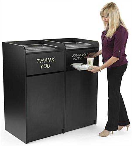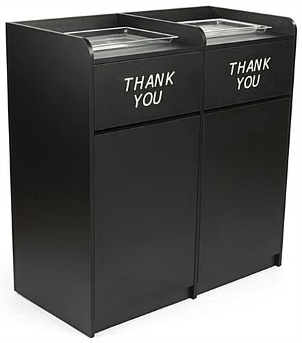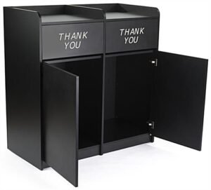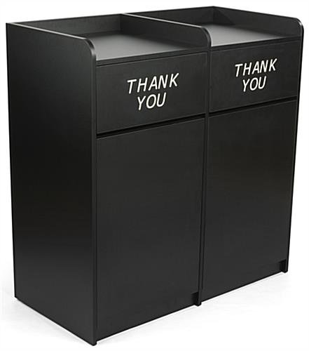 These side by side restaurant waste receptacles feature an eye-catching engraved “Thank You” message on the front of the hinged doors, making it clear to diners where to put their trays in cafeterias, schools, offices, shopping plazas, food courts, and more. Our double-sided trash containers have an open shelf on top where you can easily store soiled trays, platers, food baskets, and more after use. The sleek black side by side restaurant waste receptacles are made of 18mm thick particle board and coated with melamine, lasting for years to come in any kitchen setting. The smooth finish protects against normal kitchen conditions such as heat, moisture, and stains, making it effortless to clean due to its thick outer layer. Our black engraved “Thank You” garbage pails with hinged doors accommodate trash cans or recycling bins of up to 36 gallons each in size. Easily remove refuse from the barrels by opening the front swinging doors. Our modern side by side restaurant waste receptacles with melamine finish are great for keeping garbage bags out of sight, making any cafeteria appear clean and neat.