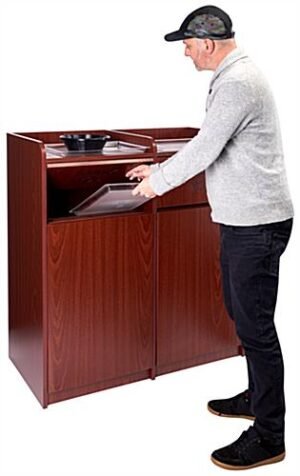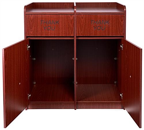This waste cabinet features engraved “Thank You” messages on both hinged doors, perfect in schools, cafeterias, food courts, malls, and more. The side-by-side trash receptacles include recessed top shelves, making it convenient for customers to return dirty dishes and keep trays and plates organized. This engraved waste cabinet has a smooth mahogany-colored melamine coating, which is effortless to wipe down in a timely manner. Our heavy-duty containers can hold two 36 gallon liners, ideal for recycling and garbage disposal. The eye-catching “Thank You” lettering on the hinged doors highlights where diners can get rid of their rubbish. There are also double doors that open from the center, making it easy to maneuver the trash bins when it is time to empty the receptacles. Use this mahogany waste cabinet with a melamine finish to add a more professional touch to any facility while keeping garbage bags out of sight.