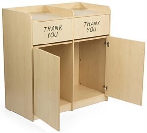 These maple wooden restaurant trash cans have recessed top shelf areas, perfect for customers to discard trays or baskets in any food establishment. Assemble your garbage containers to hold (2) 36 gallon waste receptacles with the included hardware and tools. Our melamine coated maple wooden restaurant trash cans feature an engraved “Thank You” message on the side-by-side hinged doors, excellent in shopping plazas. The garbage containers are constructed of 18mm thick particle board, ensuring a long-lasting design. The melamine coating protects the waste receptacles from kitchen heat, moisture, staining, and more, making them easier to clean at the end of the day. When the time comes to empty the containers, you can effortlessly switch out the garbage pails and recycling bins using the side-by-side swinging entrances. Our engraved modern maple wooden restaurant trash cans with a “Thank You” message on the hinged doors are excellent for hiding refuse and keeping a clean appearance at chain eateries, food courts, cafeterias, and more.