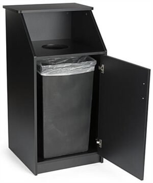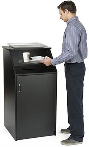This waste receptacle enclosure features a top loading opening which conceals refuse and provides an area for customers to rest trays. The heavy-duty trash bin holds a 36 gallon barrel, excellent for recycling and disposing of garbage in chain eateries, food courts, cafeterias, and more. Our black, hinged waste receptacle enclosure is made of durable 18mm thick particle board, ensuring a stable design that will last for years to come. Effortlessly switch out the garbage or recycling bin using the swing-open front. This top loading refuse container with a hinged door has a sleek black melamine finish that will last for years to come in any hospitality setting. The smooth coating protects the trash bin from kitchen heat, moisture, staining, and more. This modern waste receptacle enclosure with a melamine finish is ideal for keeping refuse out of sight and maintaining a clean appearance in food courts, cafeterias, schools, and more.
