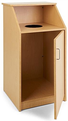 This restaurant trash receptacle features a top loading tray shelf which gives customers a place to store used platters and dishes when they throw away garbage at food courts and cafeterias. The heavy-duty fixture is made of particle board and includes a circle opening to dispose of waste quickly and easily. Our top loading maple restaurant trash receptacle also has a front hinged door, perfect for promptly replacing liners when needed. This USA-made container can hold one 36 gallon bin, an ideal size for recycling or garbage disposal. The maple hinged waste barrel has a sleek melamine coating, which protects against kitchen conditions such as heat and moisture. This finish also makes it effortless to clean at the end of each day. Use this melamine restaurant trash receptacle in food courts, chain eateries, cafeterias, and malls while keeping liners neat and out of sight from diners.