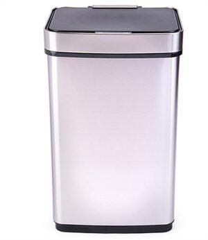 This motion sensor trash can has no liner bucket, simply secure the trash bag around the container’s plastic rings for a secure fit.