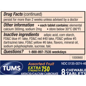 TUMS Smoothies Antacid, Extra Strength 750mg, Assorted Fruit, 250 ct