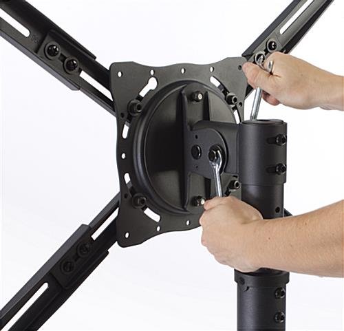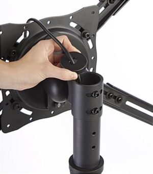 Our window flat-screen display stand features a rear-facing, counter-weighted base for placing your television in a storefront window without the need to bolt the unit to the floor or wall. Our customers use these digital screen mounts to increase their advertisement potential in retail stores and shopping centers alike. The window flat-screen display stand has a height-adjustable design, with 8 set heights, to perfectly position a flat screen monitor. The rotating and tilting bracket is VESA-compatible, and fits most screens between 32” and 47” that weigh less than 77 pounds. This window flat-screen display stand has an in-post cable management system that keeps presentations looking neat and professional in high-traffic environments. Wheels at the back of the base allow for effortless repositioning when needed.