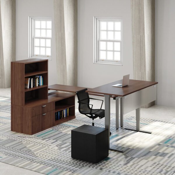A stand up desk offers great ergonomic and overall health benefits. This typical offers you the benefits that come from periodic standing while hard at work, while also offering great practical storage and organizational space. The personal file cabinet, open hutch, and open bookcase provide you with more than enough space to store your office essentials and files. The modesty panel provides privacy when you need it. This typical is available in eight finishes, so you can choose the one that best complements your office decor.
