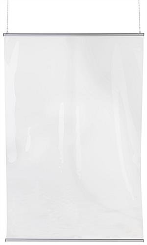 Our 48″x72″ flexible hanging PVC cashier shield is the perfect social distancing solution that limits virus spread throughout high traffic areas in your establishment. Easily suspend this cough and sneeze guard above sales counters, reception desks, or transaction windows with our hanging hardware (KITCH60/KITFL60 sold separately) to create a safe barrier between your employees and customers. Each hanging PVC cashier shield is constructed of durable ultra-thin vinyl and includes dual silver aluminum snap brackets that hold the clear film in place for easy ceiling mounting. This protective panel’s transparent design enables full visibility of customers for minimal visual disruption during the checkout process. In addition, if your store layout changes over time, the featured vinyl film can conveniently be cut to accommodate your merchandising needs. Use our flexible PVC cashier shield to provide a safe and hygienic space for patrons and staff at any retail, grocery, or convenience store today.