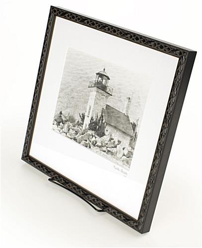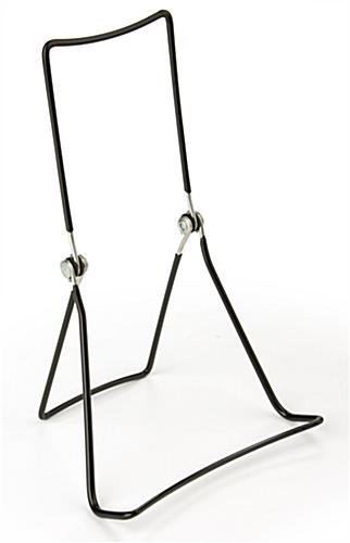 This foldable easel is great for propping up cookbooks, plaques, china, or framed art. This countertop riser features three sections that can all be adjusted to create an optimal viewing and displaying angle. This tabletop stand, foldable easel features a triple wire design to help support slightly larger objects. The coated wire design also helps to minimize movement and marking on counters. This tabletop holder is a fantastic display easel for use in museums, galleries, bookstores and gift shops. This riser was designed to maximize product exposure while minimizing the overall structural interference. Each foldable easel ships completely assembled. When not in use simply fold the three sections together for a flat, compact fixture that can be stored away in a drawer.