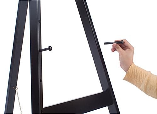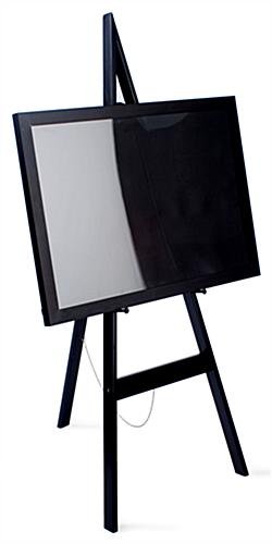 This easel stand, display easel features a sophisticated design to easily match any environment. This wooden tripod, also known as a easel stand, is constructed from quality wood with a black finish. As a result, this display easel can last a long time, and can be used for any occasion. Place this floorstanding unit in a lobby or entryway to hold a directory or eye-catching artwork. Each display easel, such as art stand and portrait holder, is a versatile means of exhibiting artwork and advertisements. The black wood will blend with any décor, and complement the painting or signage on exhibit. This easel stand features (6) peg holes on each side with (2) adjustable pegs. This type of design allows you to present different sizes of frames and boards with ease.