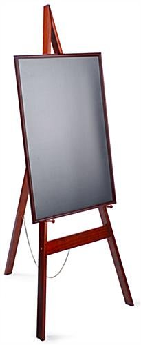 These art easels are versatile display stands for use in any business. The metal chain connects the front support bar with the back leg to maintain stability while in use. These art easels are constructed with wood and feature a cherry finish. There are also black and honey wheat options offered within this same series. These art easels also feature (2) adjustable pegs with (6) peg holes on each side to position various size frames. This versatile feature allows users to display paintings or artwork at various heights. These wooden stands, art easels can be used to display motivational posters, announcements, drawings and advertisements. These wooden stands are also lightweight for portability and storage purposes.