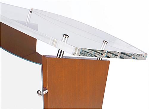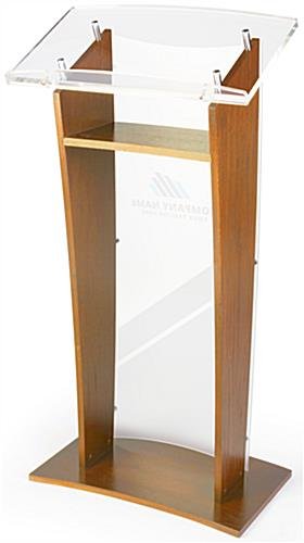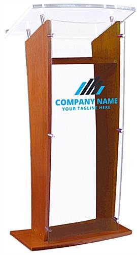 This acrylic speaking stand with custom printing lets you present your brand’s art logo in full color for a professional fixture. The clear front panel provides a crisp full front panel imprint area for a business to showcase a visual or slogan for instant customer recognition. The personalized speaking stand with custom printing includes a clean maple display and also features an interior shelf ideal for keeping notes and presentation materials organized. Each lectern ships fully assembled so you can use it right out of the box and show off your personally designed art logo in color on the clear front panel. The speaking stand can be used at business conferences, universities, hotels, or even trade shows for a uniquely printed piece.