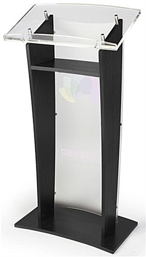This printed public speaking stand offers an upscale and customizable appearance to audiences at conference halls, trade shows, hotels, or other business environments. The frosted acrylic panel provides a large surface perfect for a small logo and brand name or a full cover design. The presentation speaking stand features UV printing for high quality images that can be produced in any color to best represent your business. Shipping fully assembled, your customizable lectern will be ready for presentation to your audience upon delivery. The speaking stand also features a 14.8” wide shelf to offer a place for notebooks, laptops, or other speech materials. For your next conference or trade show, take your presentation to the next level and differentiate yourself with a unit proudly showcasing your brand.